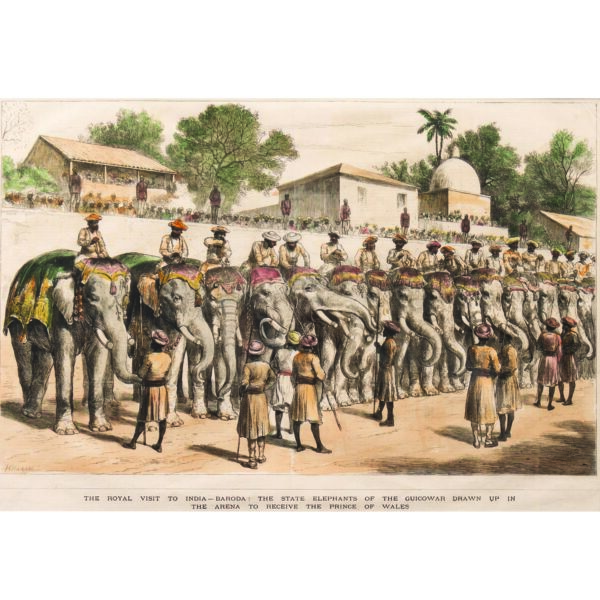 THE ROYAL VISIT TO INDIA-BARODA: THE STATE ELEPHANTS OF THE GUICOWAR DRAWN UP IN THE ARENA TO RECEIVE THE PRINCE OF WALES