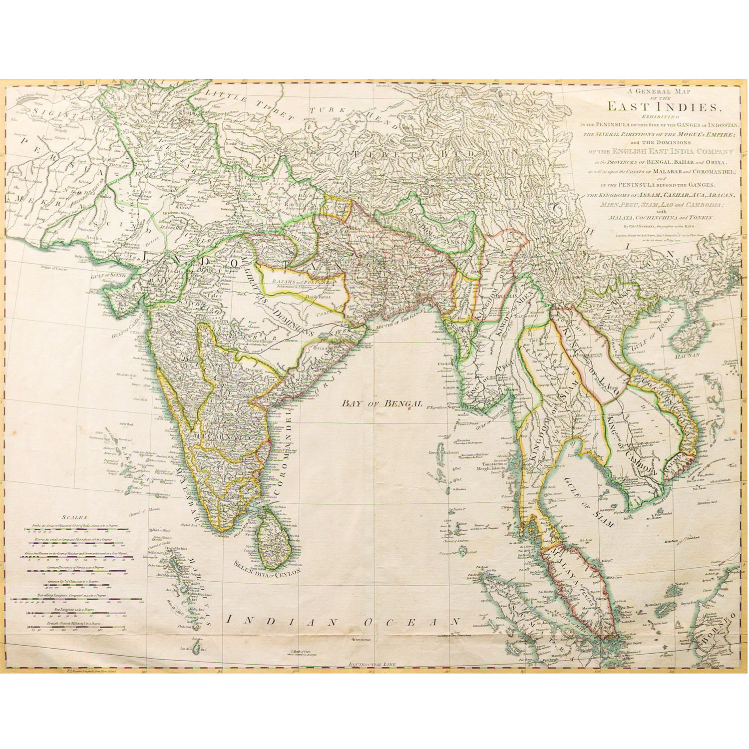 The map is exhibiting the peninsula on the side of the Ganges .The several Partition of the Mogul’s empire and the dominions of the English east India company in the provinces or Bengal, Bihar and origamis well as upon the coasts of Malabar and Coromandel and in the peninsula beyond the Ganges. Scarce antique engraved coloured map of India and Southeast Asia, by Laurie and Whittle, and with information from James Rennell, published in London in 1794.