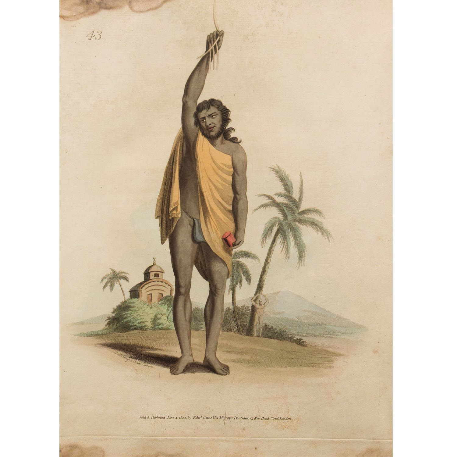 This is a Faquiror holy mendicant, who inflicts upon himself extreme pain and intolerable austerities, under the idea of such punishments being acceptable to the deity, some keep their limbs in distressing positions. The plate is from The Costume of Hindostan.