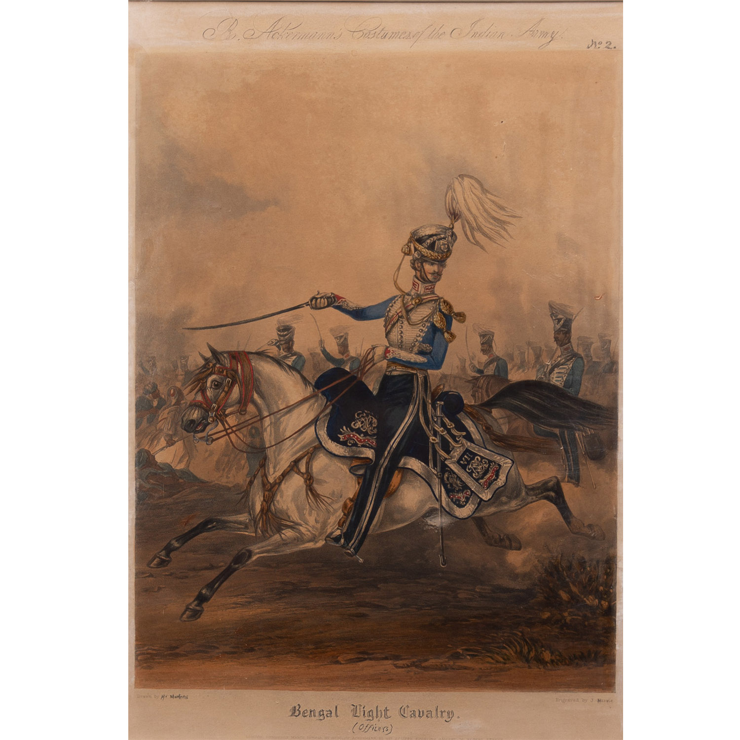 Almost a quarter of the population of ‘British India’ lived in over a hundred semi-independent princely states who had entered into treaty relationships first with the East India Company and later with the Crown. These states maintained their own armed forces, usually supplied with British officers. This is from the series Costumes of The Indian Army, published by Ackermann & Co.