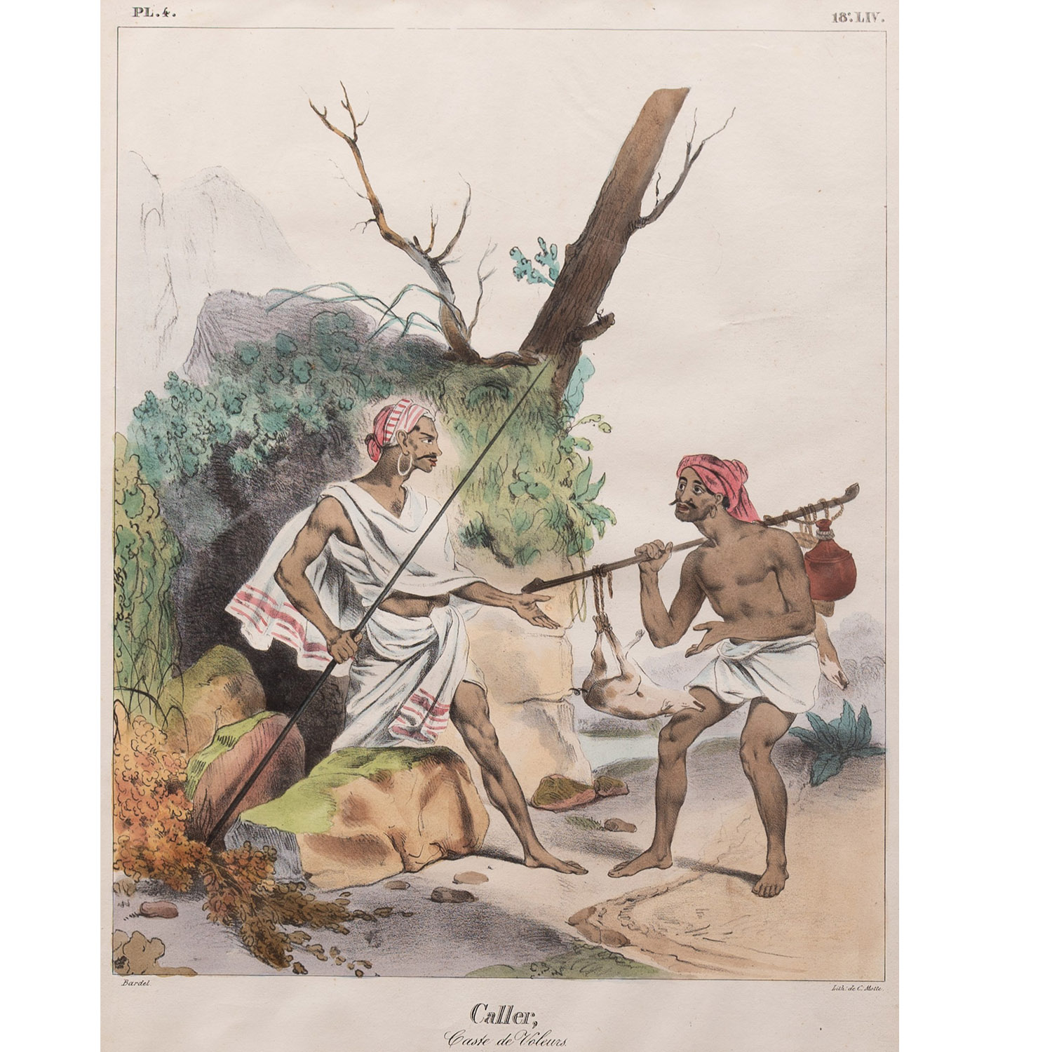This plate is from L’Indefrançaise, ou collection de dessins, published in two volumes between 1827-35.It is described as a collection of “lithographed drawings representing the deities, temples, costumes, physiognomies, furniture, weapons, and utensils, of the Hindu peoples who inhabit the French possessions of India, and in general the coast of Coromandel and Malabar”. The explanatory text written was written by Eugene Burnouf, known for his study of Sanskrit literature, translation of the Bhagwat Purana and other texts. His descriptions focus on costumes, rituals and beliefs of the people.