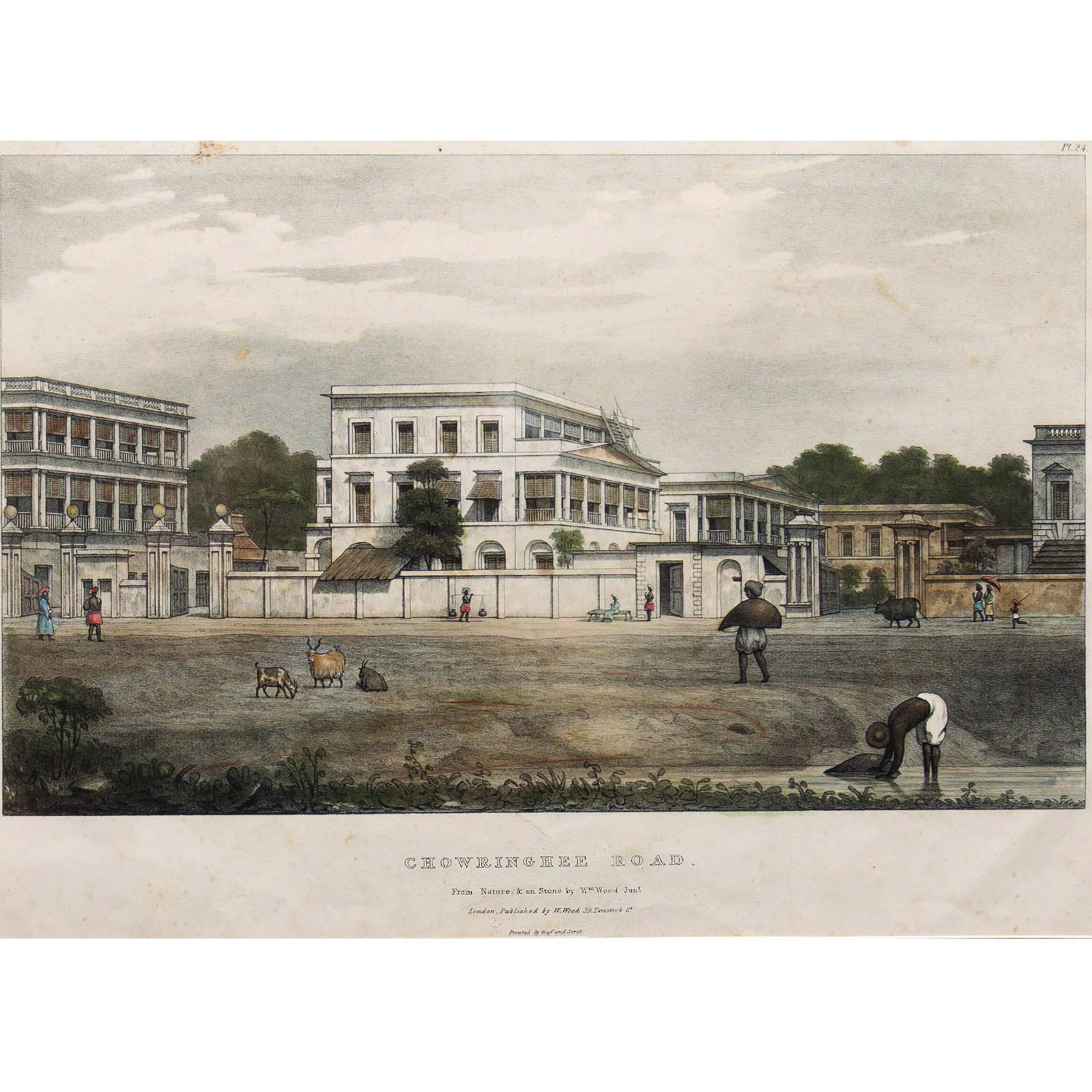 These very early views of Calcutta; published as a set; were drawn by William Wood Junior during his stay in the city, they was titled Panoramic Views of Calcutta. This set of lithographs of old Calcutta, presents an almost continuous panorama of buildings as viewed from the maiden or Esplanade. Starting with Chand pal ghat, the views extend along Esplanade row and then turn into Chowringhee. Several mansions are seen under construction with bamboo scaffolding, while in the foreground people tend their animals, wash their clothes or themselves in the public tanks and relax in groups, smoking their hookas.The views were a quaint mixture of a growing urban skyline with magnificent mansions and government buildings while the native and relaxed pace of life was shown by the figures and animals which dotted the scene.