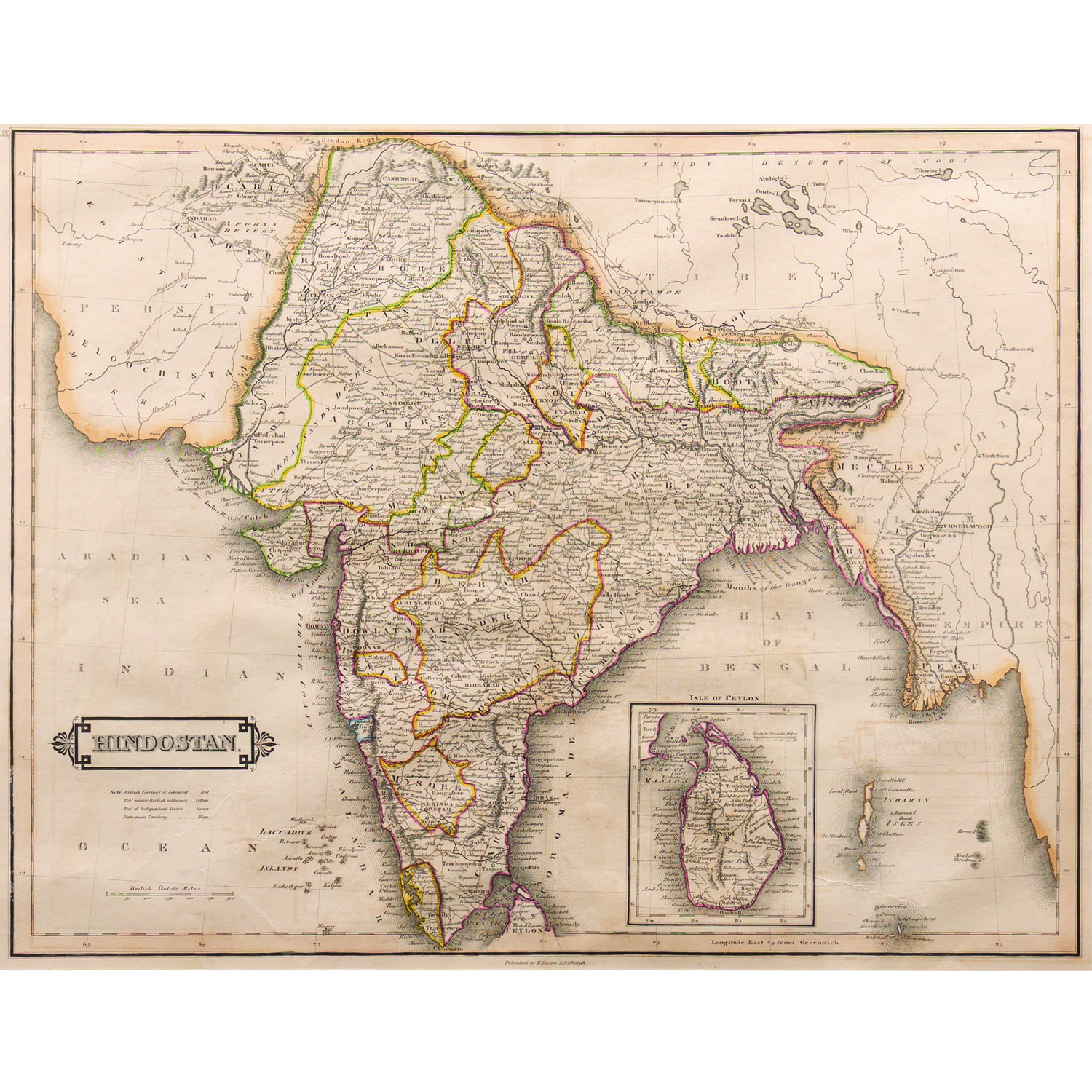 This Hand coloured map of Hindostan was published by W Liza’s Edinburgh in 1830s.