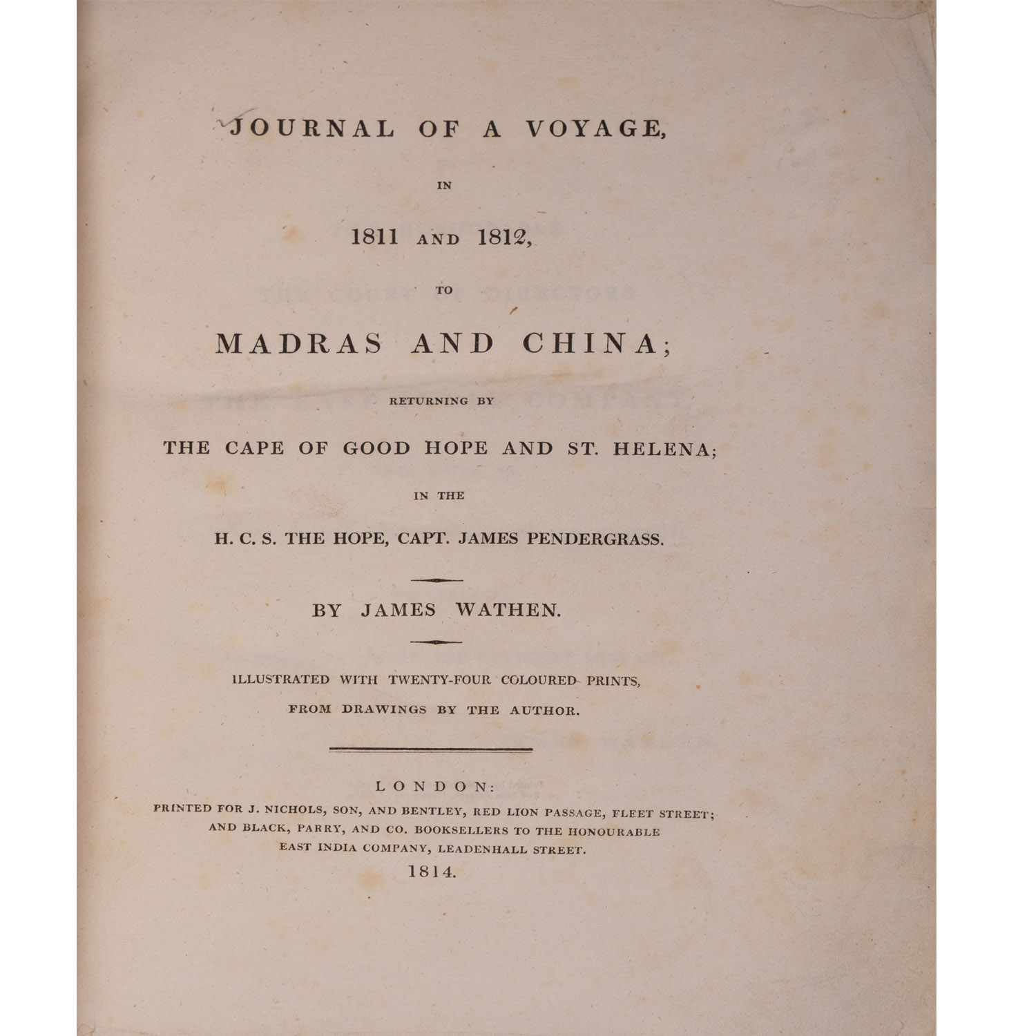 The book documents Wathen voyage to India and China with his school friend, Captain James Pendergrass. The voyage began in England, and the ship visited Madras, Pondicherry, Pulo Penang, Malacca, and Canton, before returning to England by way of the Cape of Good Hope and St. Helena. Wathen’s journal includes his observations of the cultures, flora, and fauna encountered during the voyage, as well as interactions with the diverse crew and passengers aboard the vessel.