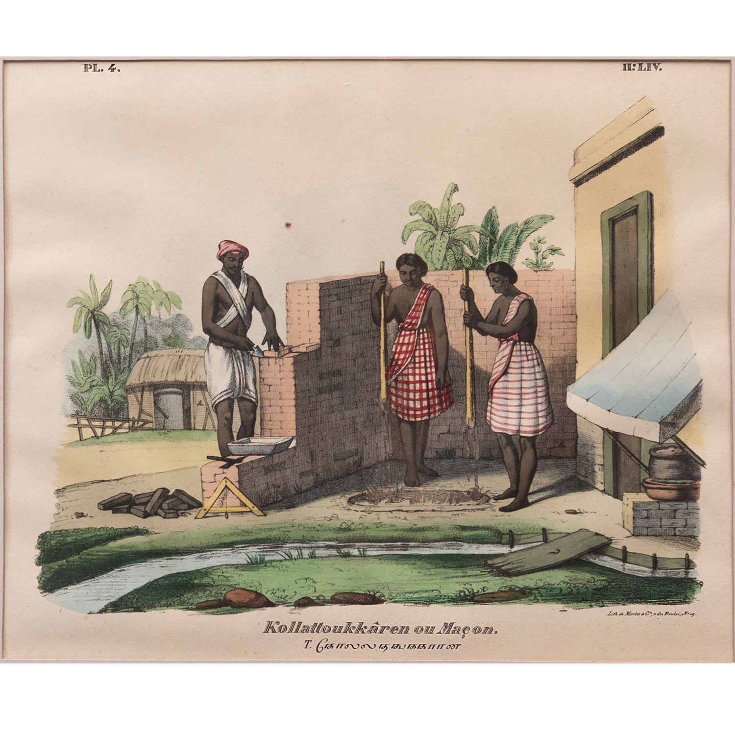 This plate is from L’Indefrançaise, ou collection de dessins, published in two volumes between 1827-35.It is described as a collection of “lithographed drawings representing the deities, temples, costumes, physiognomies, furniture, weapons, and utensils, of the Hindu peoples who inhabit the French possessions of India, and in general the coast of Coromandel and Malabar”. The explanatory text written was written by Eugene Burnouf, known for his study of Sanskrit literature, translation of the Bhagwat Purana and other texts. His descriptions focus on costumes, rituals and beliefs of the people.