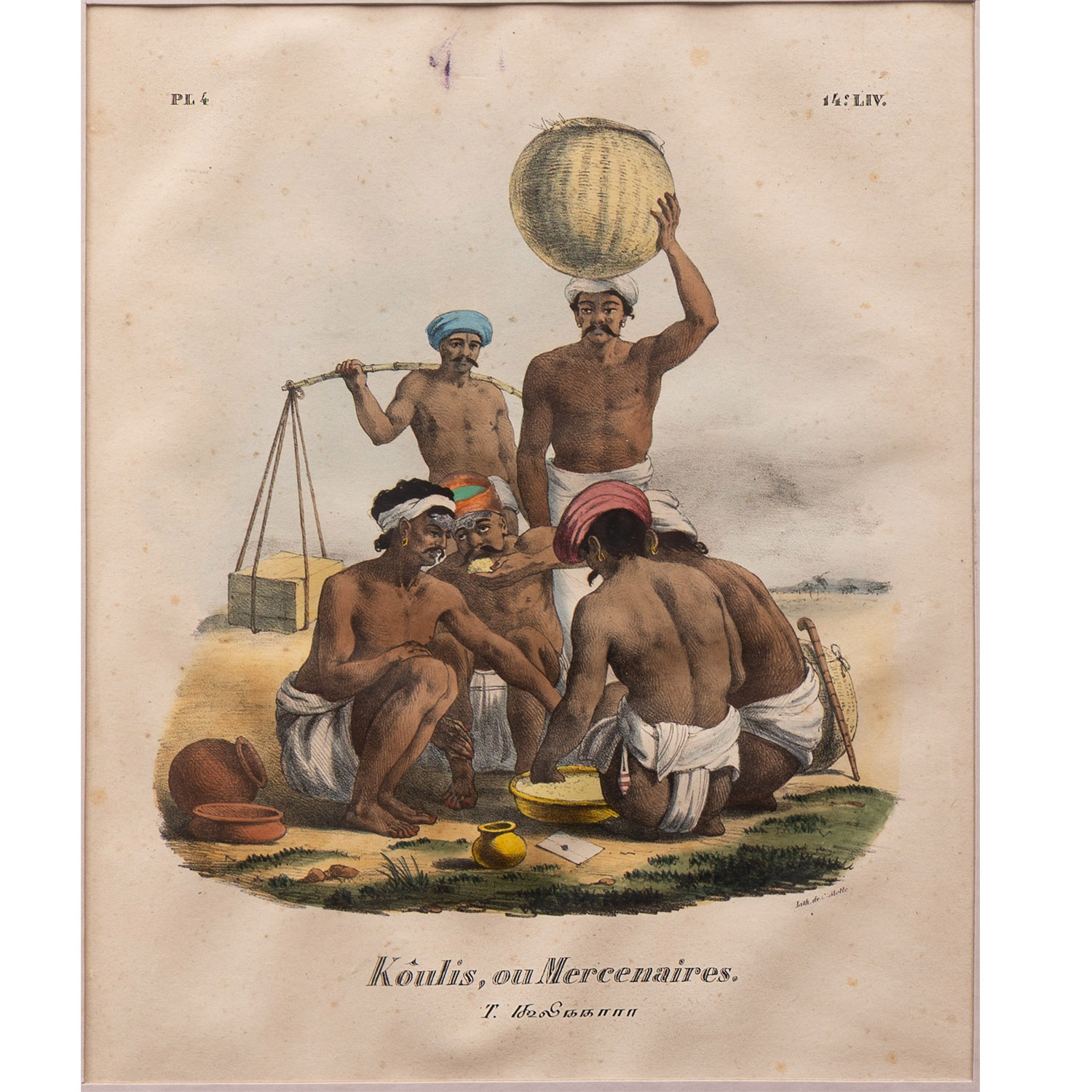 This plate is from L’Indefrançaise, ou collection de dessins, published in two volumes between 1827-35.It is described as a collection of “lithographed drawings representing the deities, temples, costumes, physiognomies, furniture, weapons, and utensils, of the Hindu peoples who inhabit the French possessions of India, and in general the coast of Coromandel and Malabar”. The explanatory text written was written by Eugene Burnouf, known for his study of Sanskrit literature, translation of the Bhagwat Purana and other texts. His descriptions focus on costumes, rituals and beliefs of the people.
