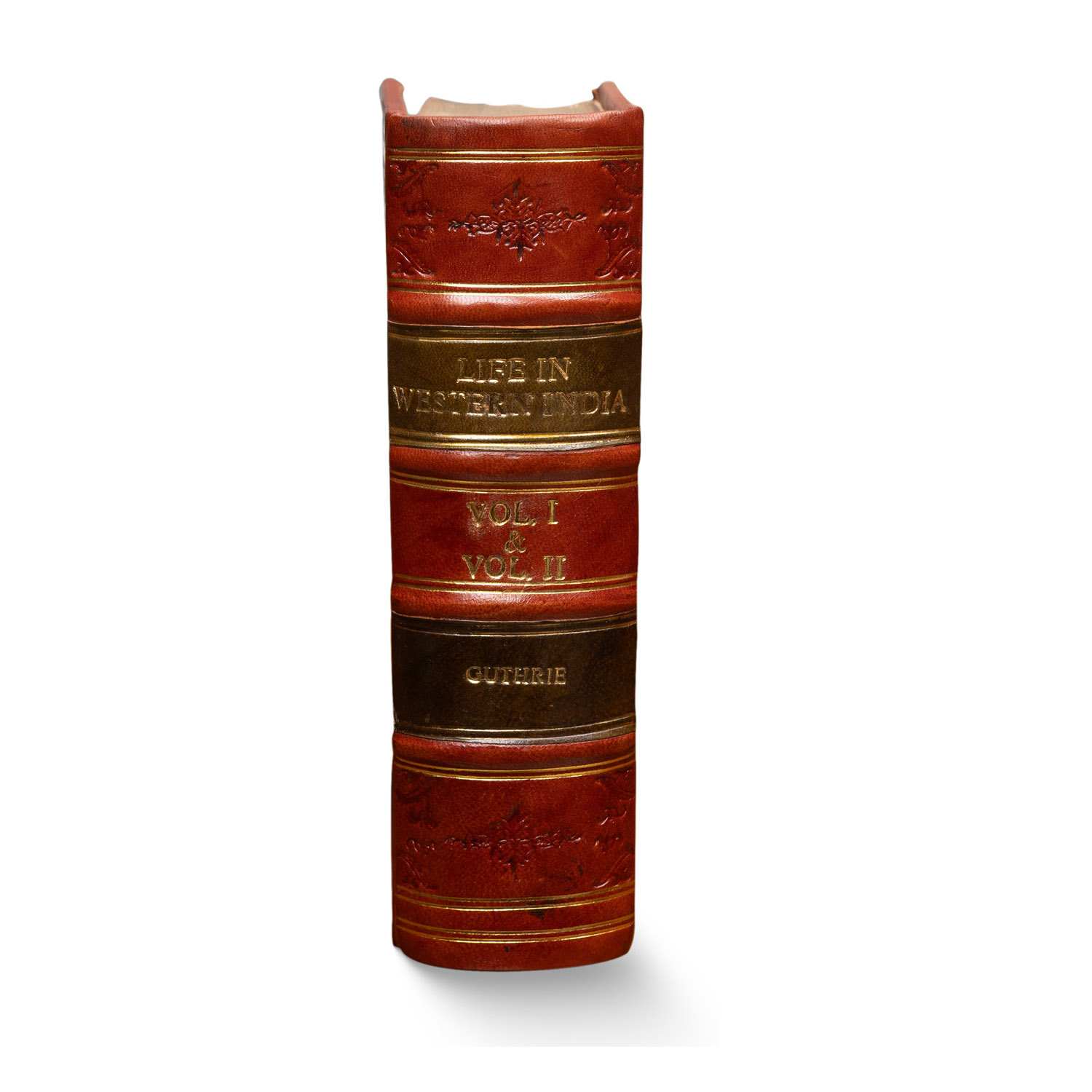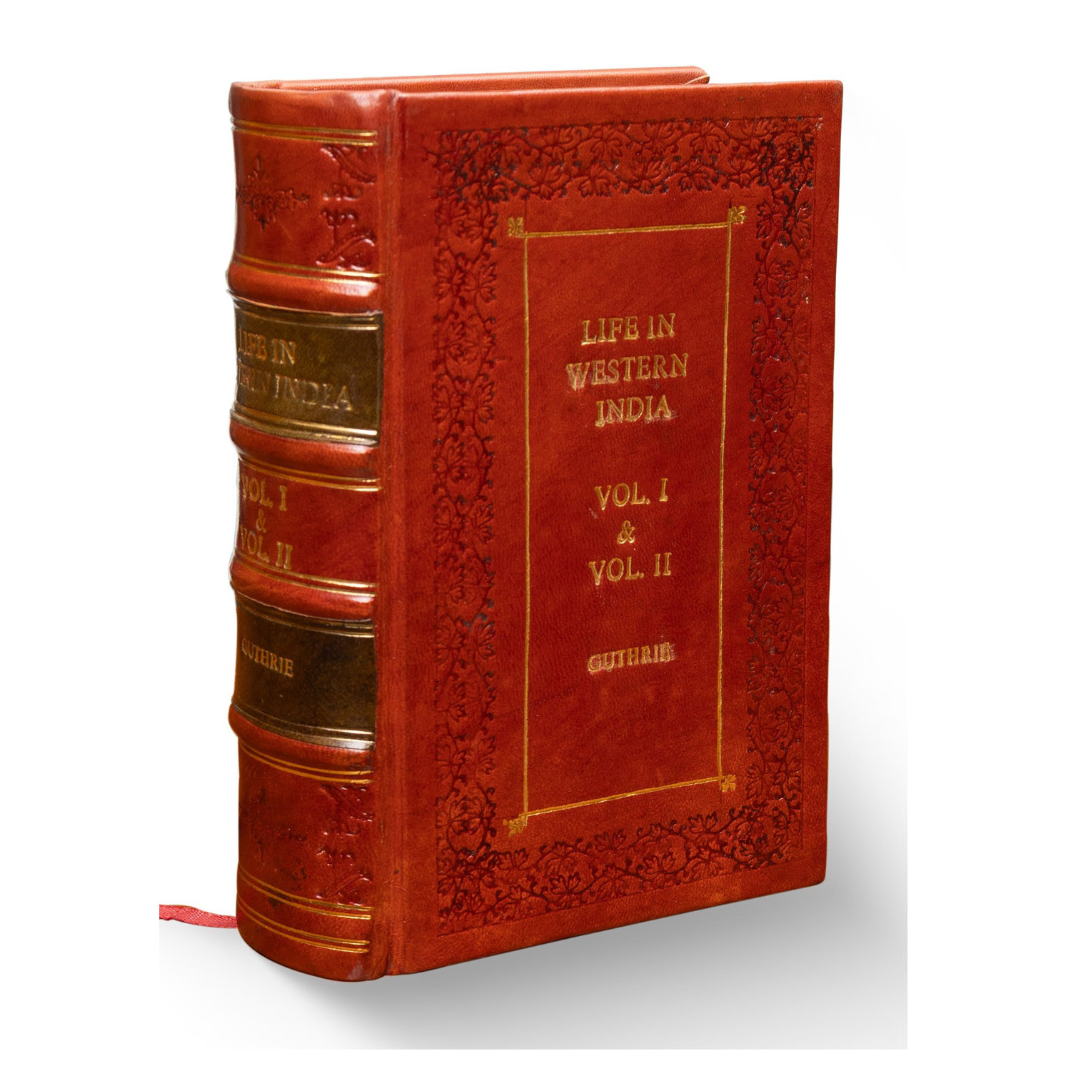 This rare volume by Mrs Guthrie is in overall good condition, featuring a full leather re-binding that speaks to its craftsmanship and age. The book contains many finely executed wood engravings, and the title page is elegantly printed in red and black. Both volumes are bound together into a single book, with all edges gilt, adding to its distinguished appearance.