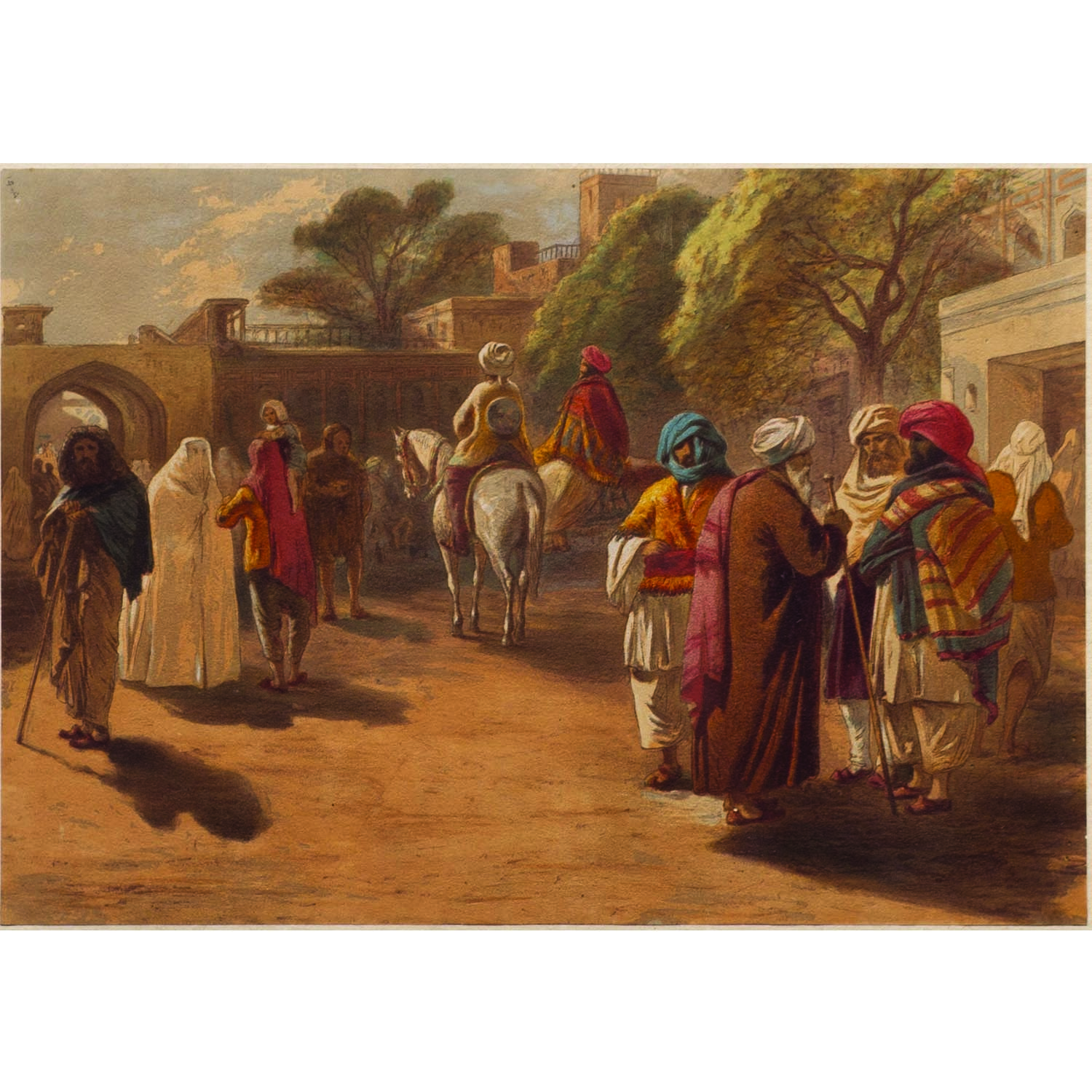 William Simpson (1823 – 1899) was a distinguished watercolourist and war artist. Having established his reputation by documenting the Crimean war in 1854, Day and Sons, the London lithography firm, commissioned him to sketch well-known sites in and around Delhi associated with the Revolt of 1857 by Indians against the rule of the British East India Company. Simpson arrived in Calcutta (Kolkata) in 1859 and travelled widely. His rapid pencil drawings formed the preparatory studies for his finished watercolours done after his return to London in 1862. His detailed journal, sketches and pictures from India resulted in these highly coloured, evocative, and romantic interpretations of the landscape and architecture. Simpson completed the painting of the Indian School in Calcutta (Kolkata) in 1859. His work, published in books like India: Ancient and Modern, provides detailed and fresh depictions of life across the subcontinent during that period.