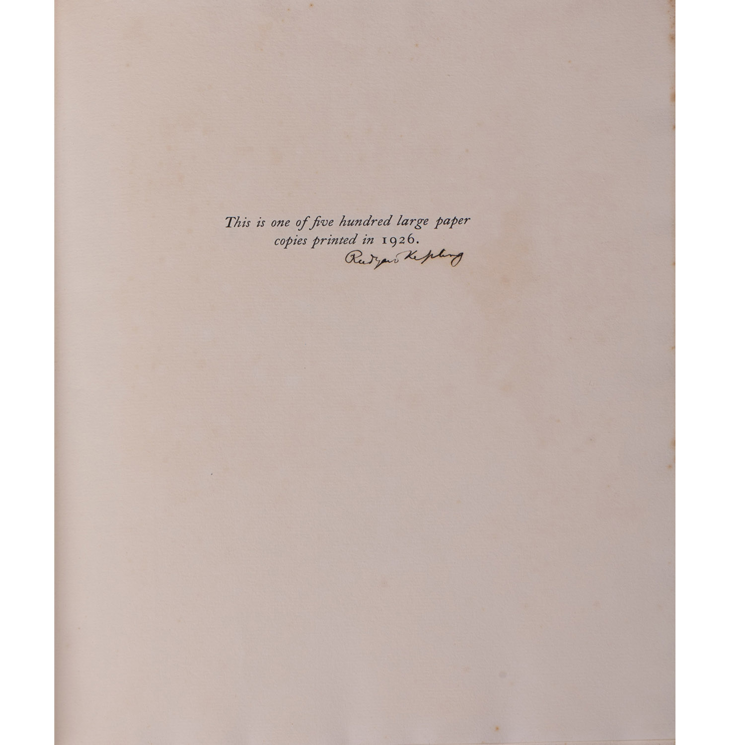 This book is the first edition signed copy by Rudyard Kipling. This is one of five hundred large paper copies printed in 1926.It is in a fine condition with minor marking on the leather board and spine, scattered spots on the front and the back pages. The edges are untrimmed and illustrated by Donald Maxwell.
