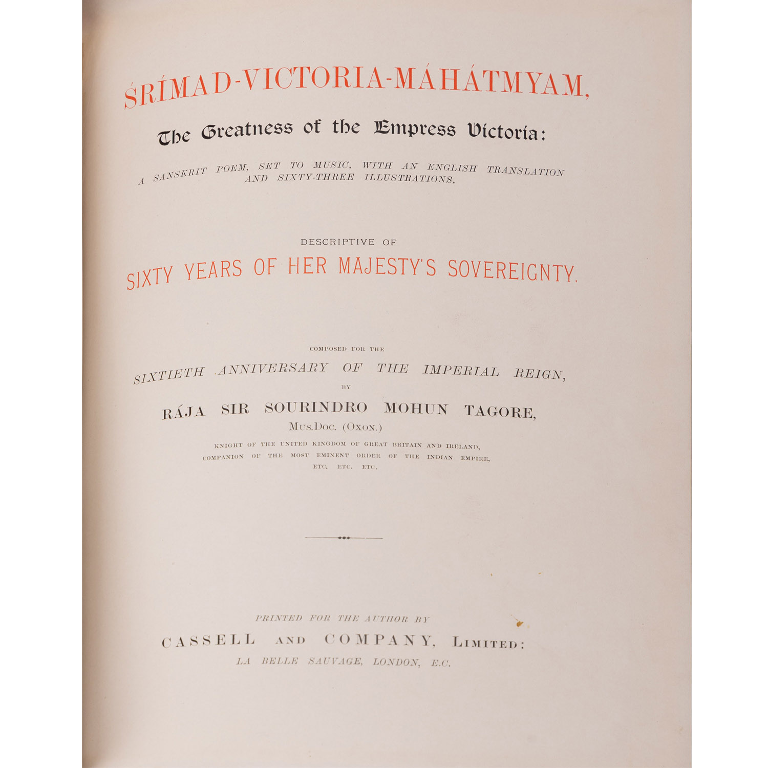 This beautifully crafted volume by Raja Sir Sourindro Mohun Tagore is in excellent condition, bound in original crushed Morocco leather with attractively ornamented covers featuring intricate gilt embossing on the front and back. All edges are gilt, adding a luxurious finish.