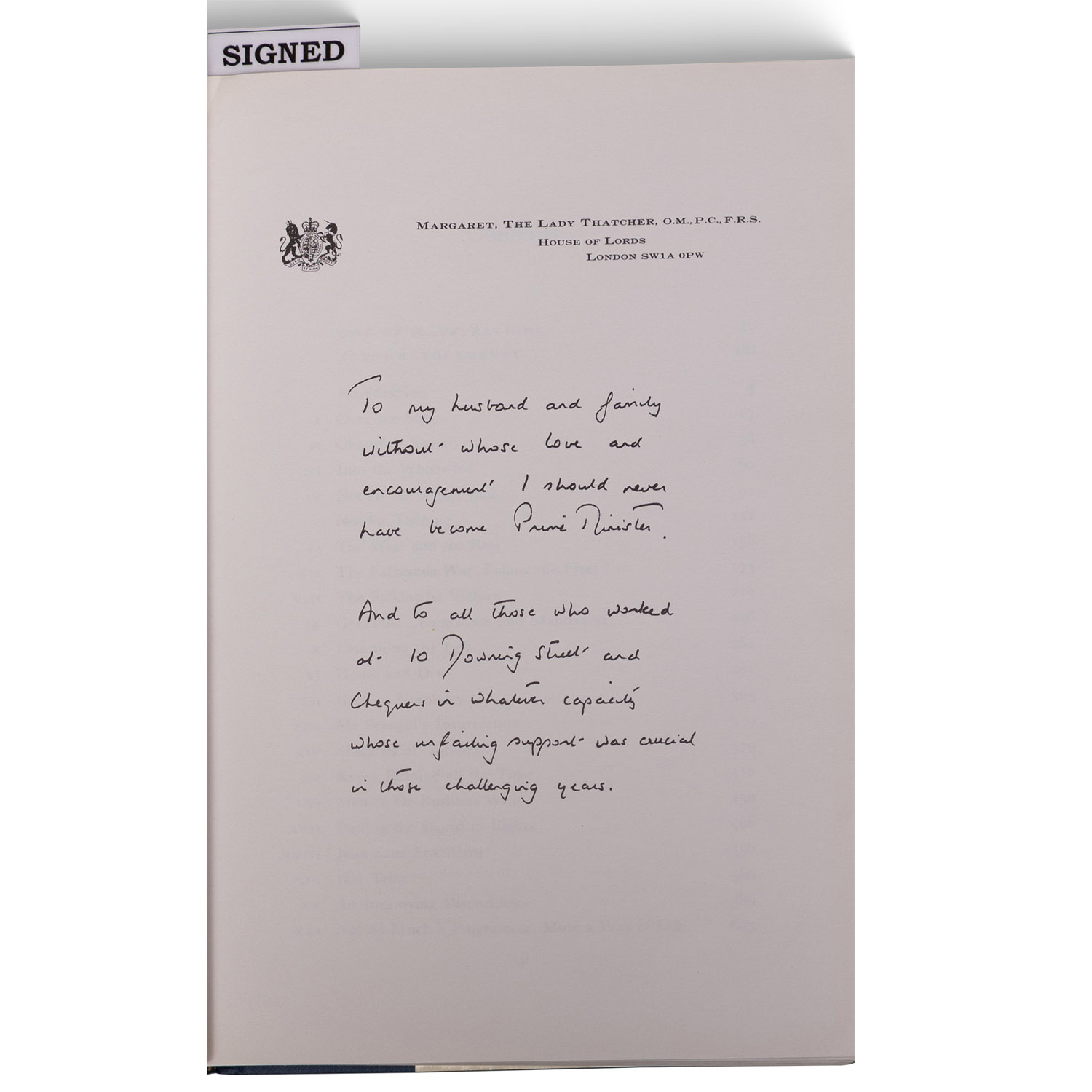 The book encompasses her memoirs the whole of her time as Prime Minister – the formation of her goals in the early 1980s, the Falklands, the General Election victories of 1983 and 1987 and, eventually, the circumstances of her fall from political power. She also gives frank accounts of her dealings with foreign statesmen and her own ministers. It has many black and white illustrations.