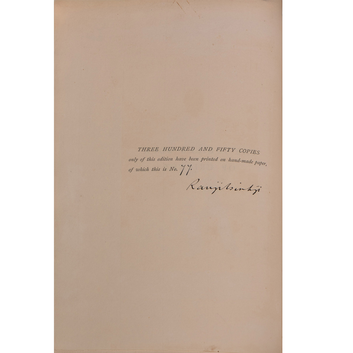 The book by K.S Ranjitsinhji is an uncommon signed limited edition of the classic book on cricket by one of the greatest batsmen of all time published to mark Queen Victoria Diamond Jubilee .It is on a hard board cloth binding extra-large copy with uncut edges & spine re-laid. This is the 77 copy out of 350 copies only of this edition have been printed on handmade paper. Illustrated with frontispiece with 115 tissue guarded photography plates of famous pre 1914 players of the “Golden Age” of the cricket including W.G. Grace, Ranjitsinhji himself, Lord Hawke etc. The Ranji Trophy in India is after his name.
